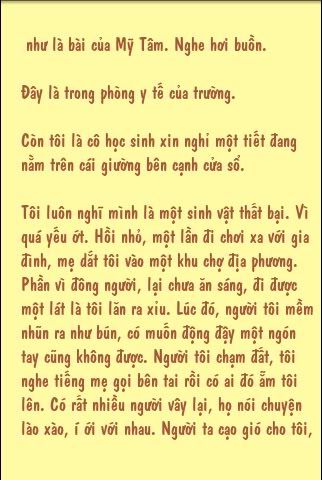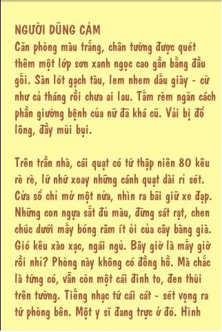-Và đây là cách mà m đã làm:// public void splitTextIntoPages() { // các chỉ mục dùng để cắt text int offsetI = 0, offsetII = 0; // Tạo Static Layout cho toàn bộ text StaticLayout layout = new StaticLayout(story, myTextPaint, width - (leftPadding << 1), Layout.Alignment.ALIGN_NORMAL, 0.5f, 10f, false); // Tổng số dòng int totalLines = layout.getLineCount(); // Số dòng từng trang int linePerPage = layout.getLineForVertical(height - (topPadding << 1)); // loop to the end int i = 0; do{ // Log.i("Thong bao", "Dang chia..."); // int line = Math.min(linePerPage * (i+1), totalLines-1); // vi tri của ký tự cuối trang offsetII = layout.getOffsetForHorizontal(line, width - (leftPadding << 1)); // Lấy subString String sub = story.substring(offsetI, offsetII); // offsetI = offsetII; // Thêm vào danh sách listOfPages.add(sub); // i++; }while (offsetII<story.length()); } ▲Ở mỗi vòng lặp, chúng ta sẽ lấy “gold position” và cắt text dựa vào nó. Các đoạn text được cắt (sẽ khớp với kích thước trang) được lưu theo thứ tự vào Vector<String> listOfPages. -Thử hiển thị trang đầu tiên: